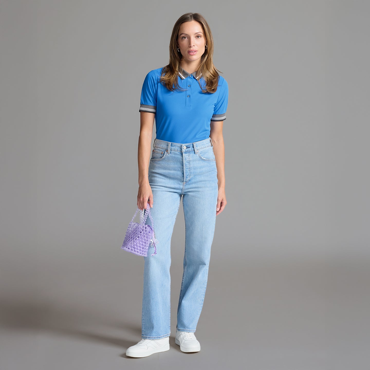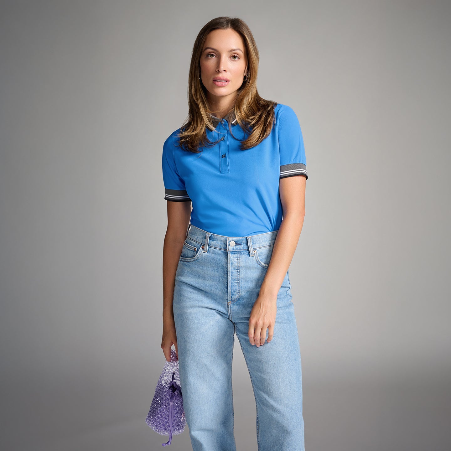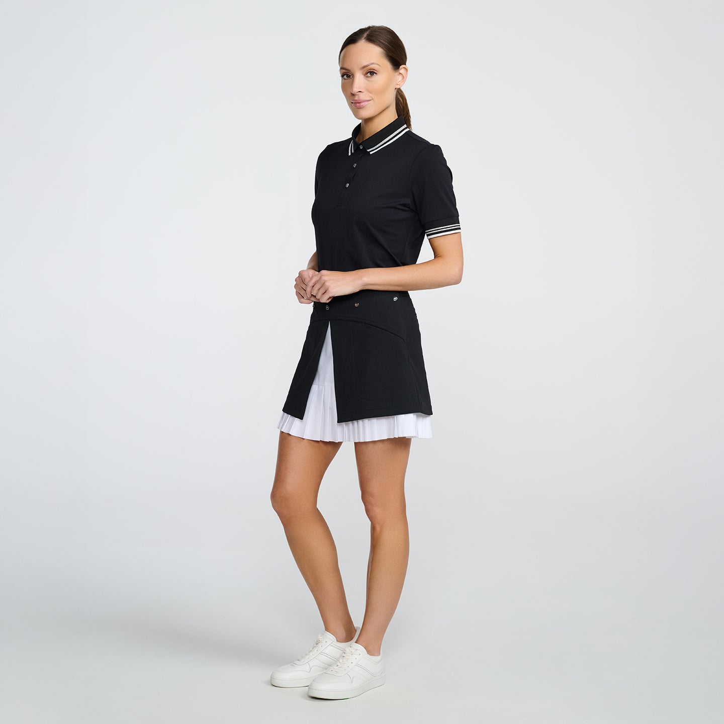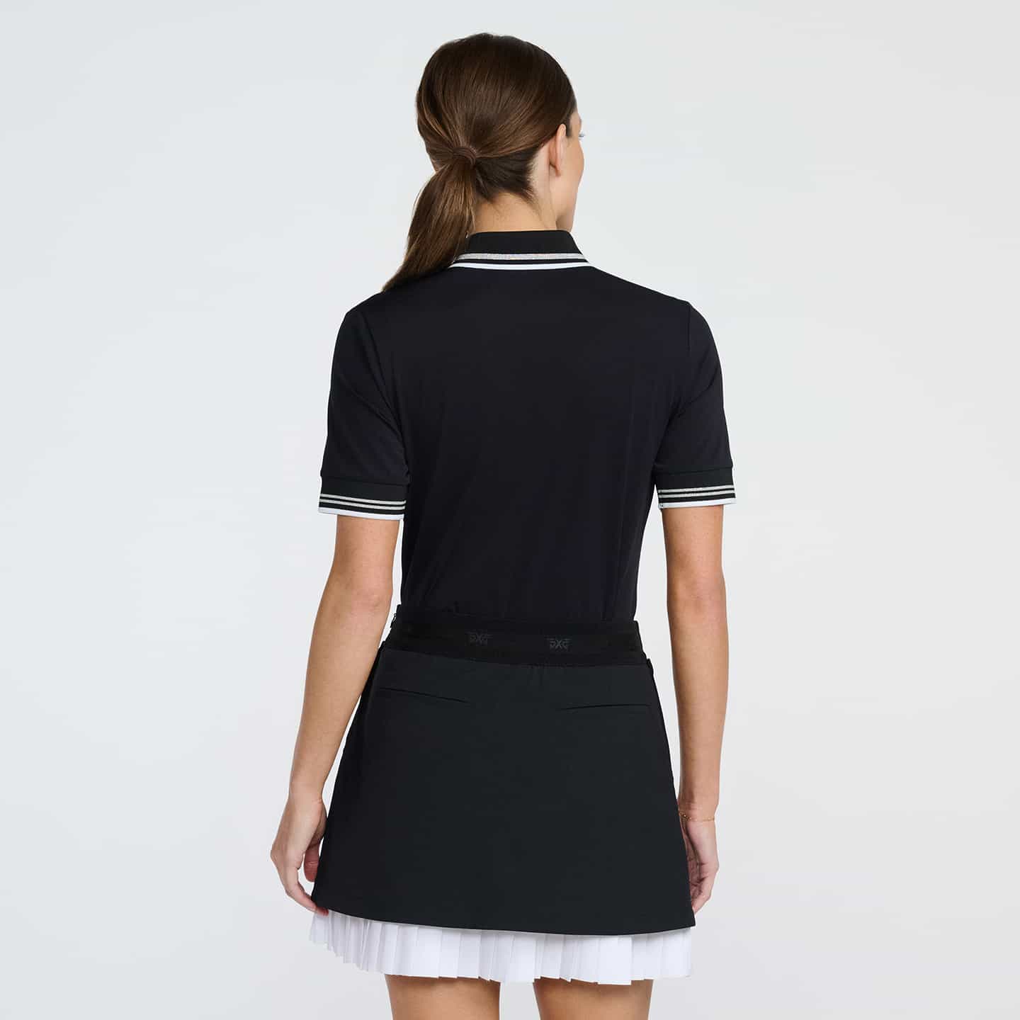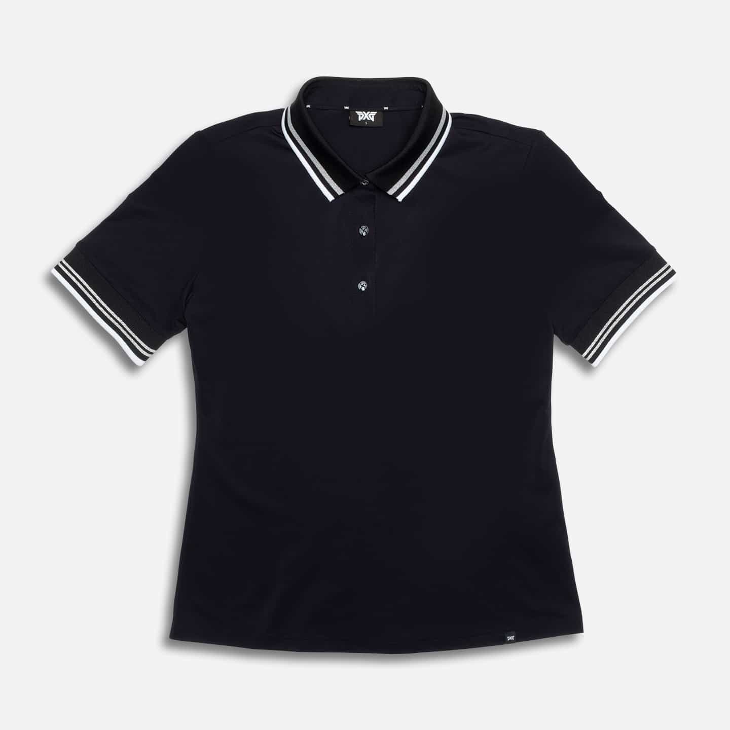 Our Women’s Ready to Play Polo is ready for the course or a day out on the town. Featured in both Black and our seasonal Cadet Blue colorways, it’s made with an elevated Italian fabric that is sustainable and breathable, with UV protection for all-day comfort. This polished polo features a lustrous texture, along with a ribbed collar and sleeves with stripe details for added elegance. Pair yours with our Saturday Skirt for a classically chic look.
